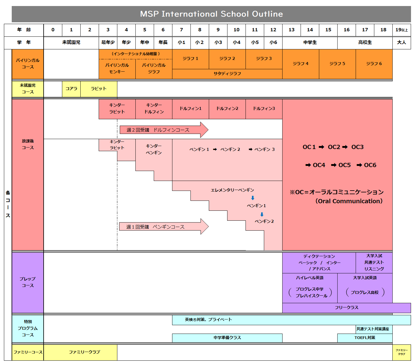 日本語の幼稚園・小学校、その後中学・高校に通いながら放課後に集中的に学ぶ、イマージョンクラスです。高校卒業までに英語だけでコミュニケーションできる高い英語力をマスターすることを目指します。