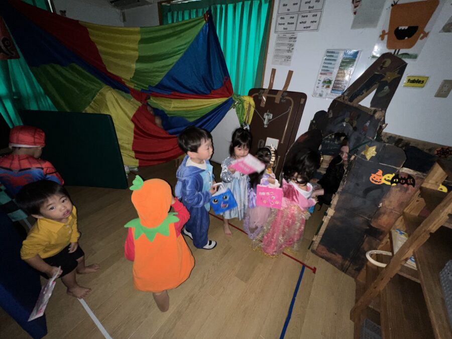 10月になるとスクールもハロウィン一色になり、子どもたちの期待は日に日に高まってきていました。当日はあいにくの雨。しかし、子どもたちは天気を気にすることもなく、登園からコスチュームを着て意気揚々。パーティに参加する気は満々。ハロウィンパーティはそれぞれのコスチューム紹介から始まり、その後は工作やダンスを楽しみました。午後からはお待ちかねの"Trick or Treat"!!暗闇の中だけど、お菓子を求めてHaunted houseのドアをたたきます。手作りのバッグの中にはお菓子もいっぱい。笑顔もいっぱいの一日でした。