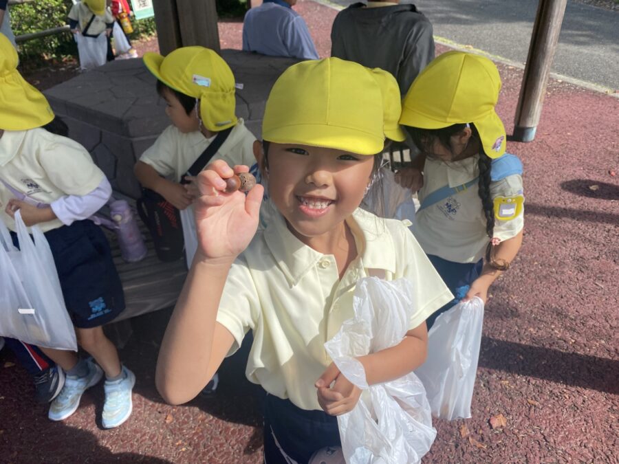 ジラフクラスは松山総合公園に、秋の木の実や落ち葉を拾いに行きました。野山を探索しながら、秋のものを次々と拾っていきます。「このどんぐり、青色に見える!」と、思い思いに自分の発見したことを友だちや先生に伝え合います。拾った木の実で、想像を膨らまして、動物や乗り物などを作りました。子どもたちの発想の豊かさにいつも驚かされます。