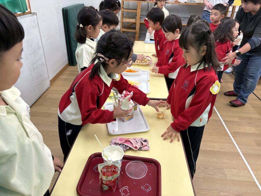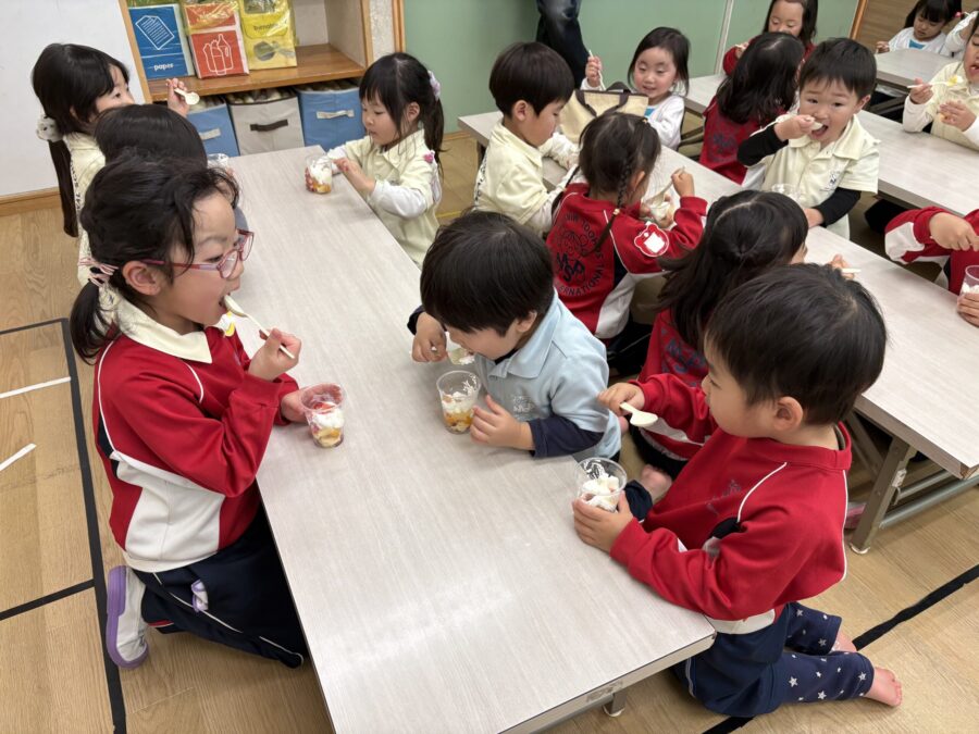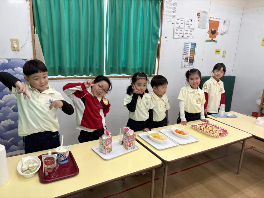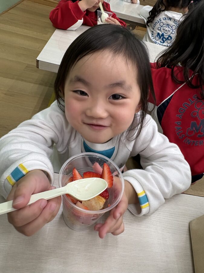 2学期の最終日の午後、ジラフクラスとモンキークラス合同のお楽しみ会でみんなが大好きなトライフルを食べました。 この日はいつも以上に盛り上がります。年長さんがスペシャルヘルパーさんになって、ひとつひとつ盛り付けをしてくれましたよ。みんなお昼ご飯をしっかり食べていたけど、あっという間に完食のバイリンガルキッズでした。おいしいものは別腹だよね♪