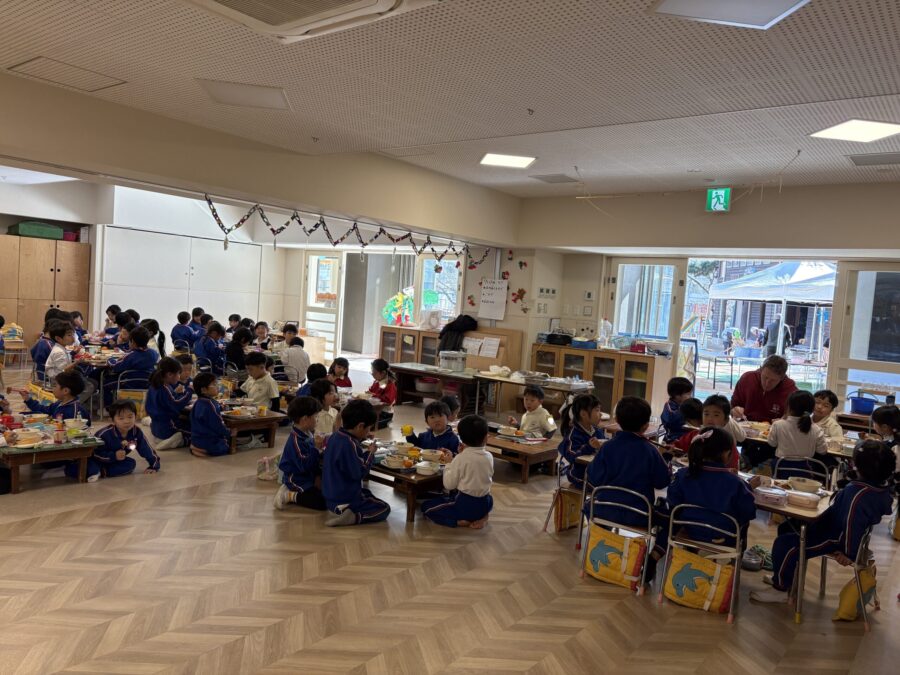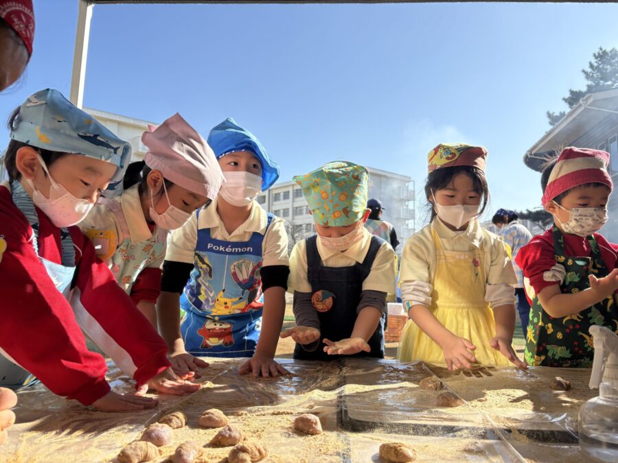 認定こども園三葉幼稚園の餅つき大会に参加させていただきました。臼と杵で餅をついた後に、紅白餅、ヨモギ餅、紫芋餅の4種類のお餅をみんなで幼稚園の友達を協力して作りました。出来上がったお餅は準備していただいたお昼ご飯のお雑煮に入れて食べたり、あんこと一緒に食べたり。なんと干し柿もいただきました。残ったお餅はお土産としていただきました。「お餅おいしいね!」「三葉の給食もとってもおいしい!おかわり!」と嬉しそうな子ども達。三葉の先生方、お友達のみなさん、ありがとうございました。