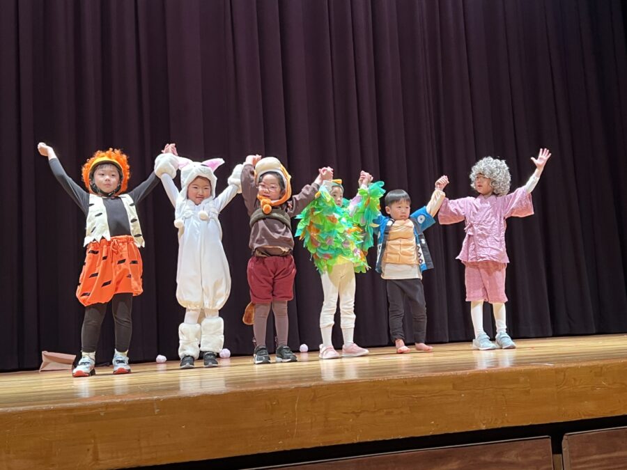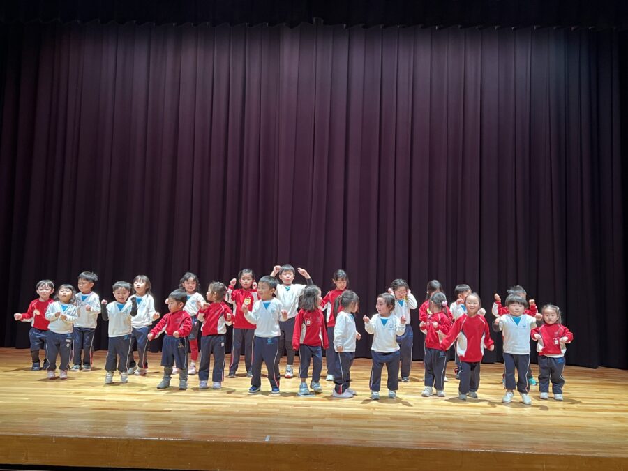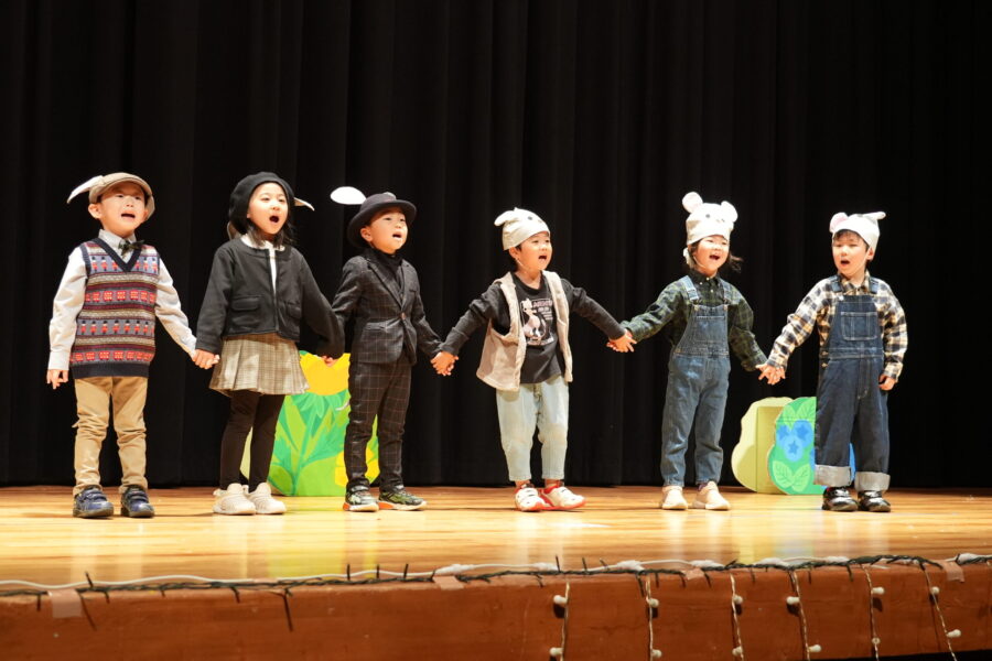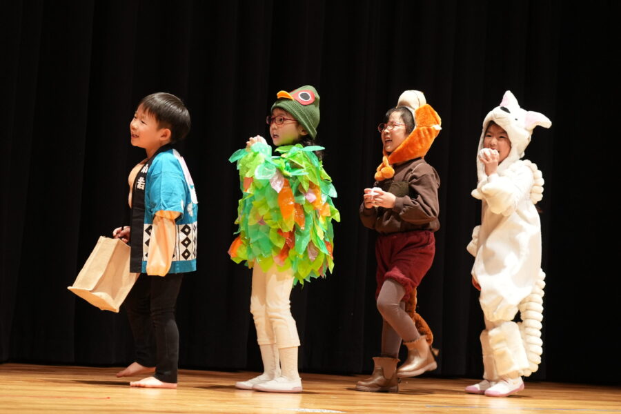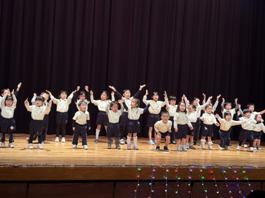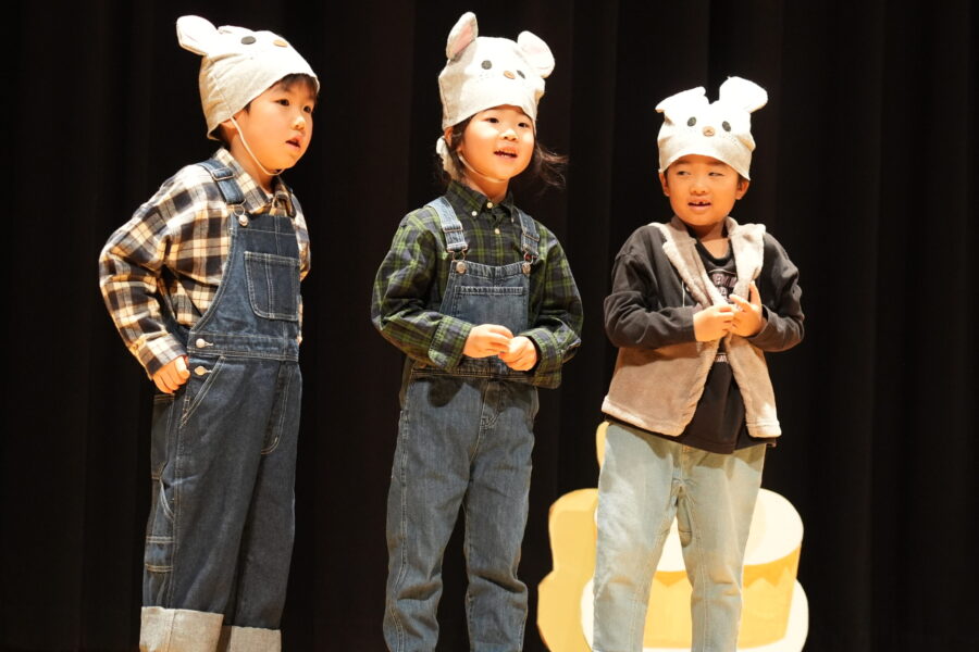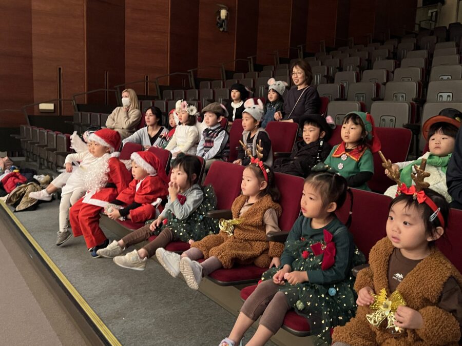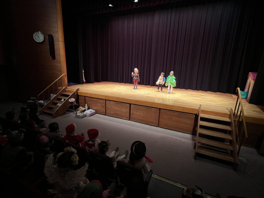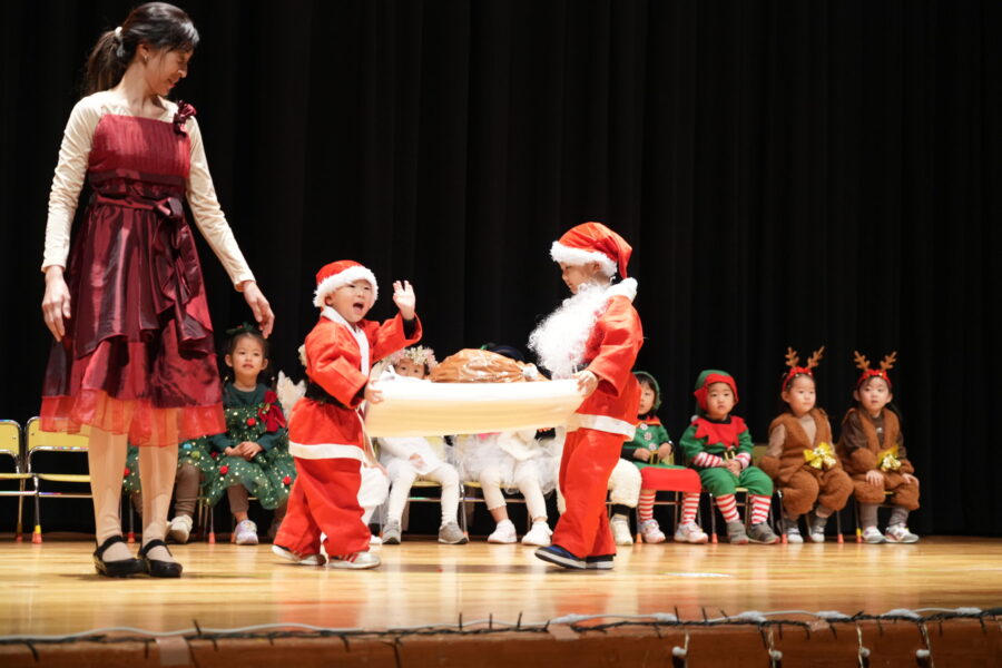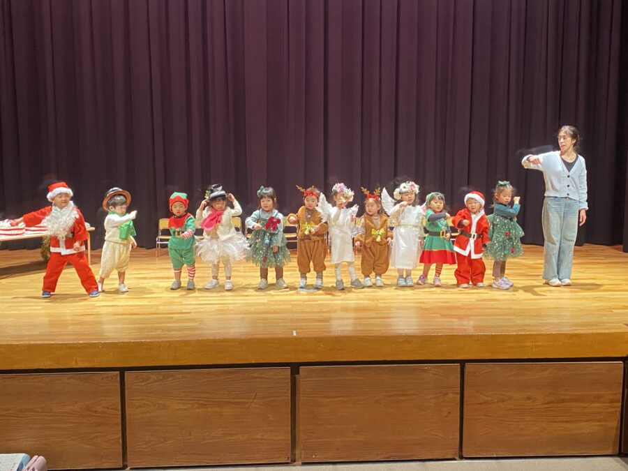 今年は愛媛県男女共同参画センターにて、ドキドキワクワクの中クリスマスリサイタル当日を迎えました。合奏「ジングルベル」、モンキークラスの劇「The Christmas Party」、ジラフクラス年中児の劇「City Mice and Country Mice」、年長児による「 Momotaro」そして最後に全員で「Santa Claus is Coming to Town」を歌いました。練習した成果を思う存分発揮した姿を保護者の方に見てもらい、満面の笑みを浮かべていました。