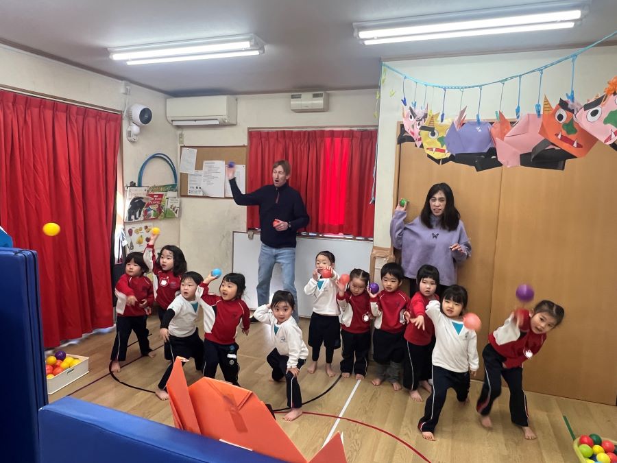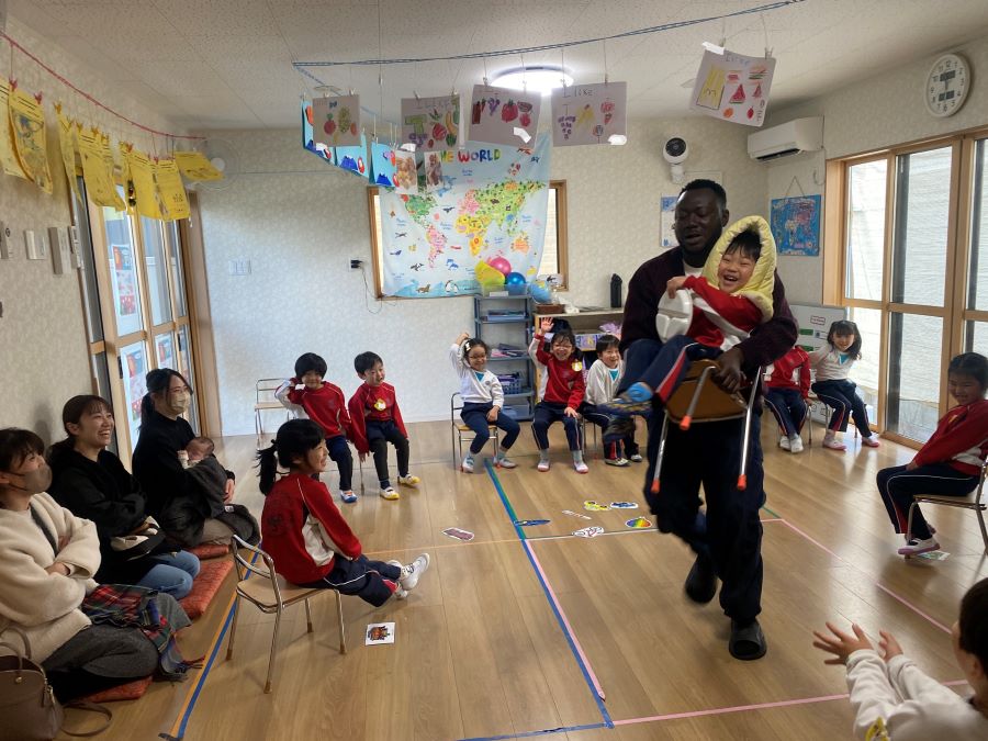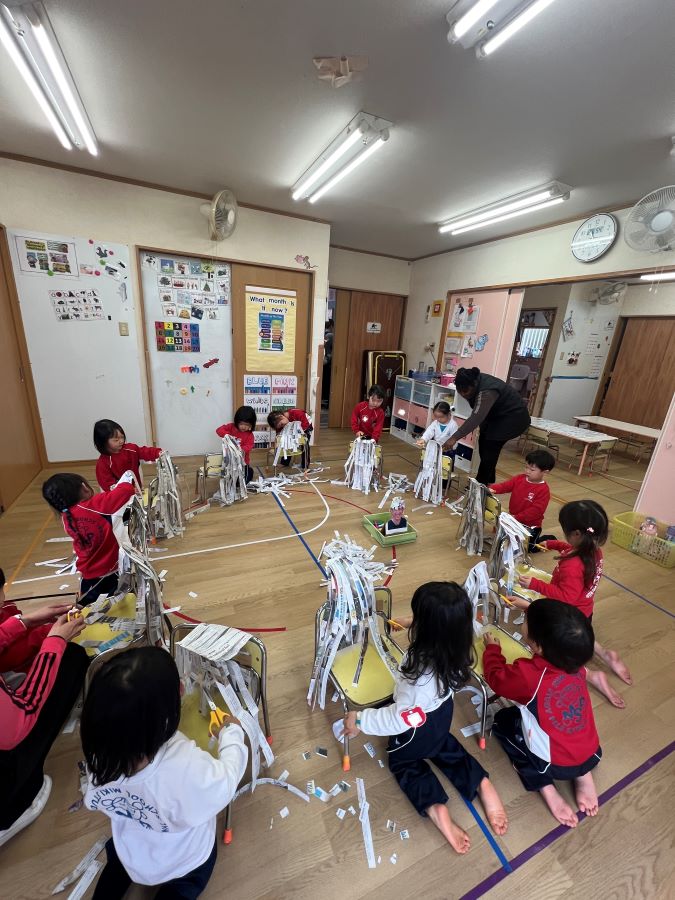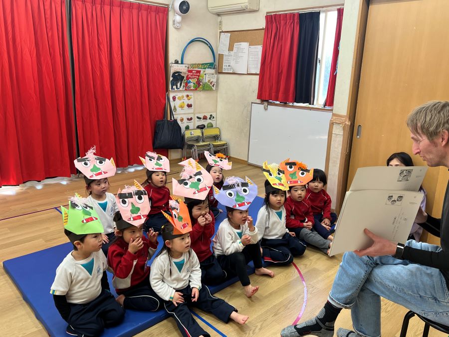 毎年恒例の節分イベントがやってきました、モンキーさんは「鬼をやっつける!」と言いながらも朝からドキドキが隠せません。鬼にぶつけるボールを並べたり、投げる練習をしたりする子もいました。そんな中で鬼役のジラフさんは着々と襲撃の準備です。モンキーさんが先生に節分のお話しを読んでもらっていると・・・鬼の襲撃が始まりました!慌てるモンキーさんでしたが、練習の成果もあって鬼を撃退することに成功!ご褒美に小学生が作ってくれた節分工作をプレゼントしてもらいニッコリ。楽しい節分になりました。
