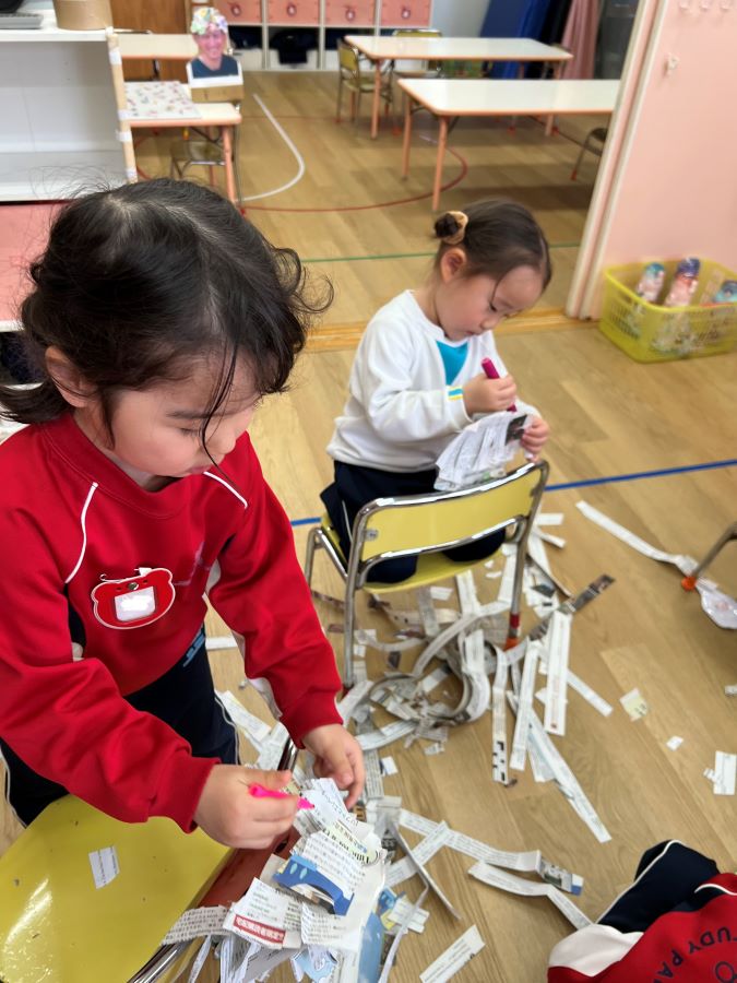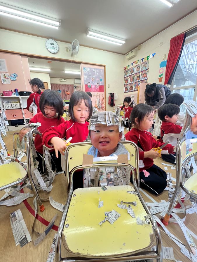 モンキークラスではクラフトの時間にハサミの練習をしました。「今日はみんなが床屋さんです。新聞紙の長い髪の毛をカットして新しい髪型にしましょうね。」と先生が伝えると子どもたちは大喜び。集中して紙(髪)を切り進めていきました。ハサミを持つ手も慣れてくると、立ち姿はまるで理容師さんみたいでとても素敵です!前髪を切ると、中から自分の写真が出てきて大笑い。髪を切った後はマジックを使ってカラーリングをしたり、ヘアアクセサリーを沢山つけたりとおしゃれな髪型に大変身。出来上がりに大満足のモンキーキッズでした。